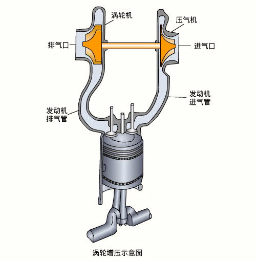 废气涡轮增压是目前世界上使用最多的发动机技术,涡轮增压器(Tubro)实际上就是一个空气压缩机。它是利用发动机排出的废气作为动力来推动涡轮室内的涡轮(位于排气道内),涡轮又带动同轴的叶轮位于进气道内,叶轮就压缩由空气滤清器管道送来的新鲜空气,再送入气缸。当发动机转速加快,废气排出速度与涡轮转速也同步加快,空气压缩程度就得以加大,发动机的进气量就相应地得到增加,就可以增加发动机的输出功率了。