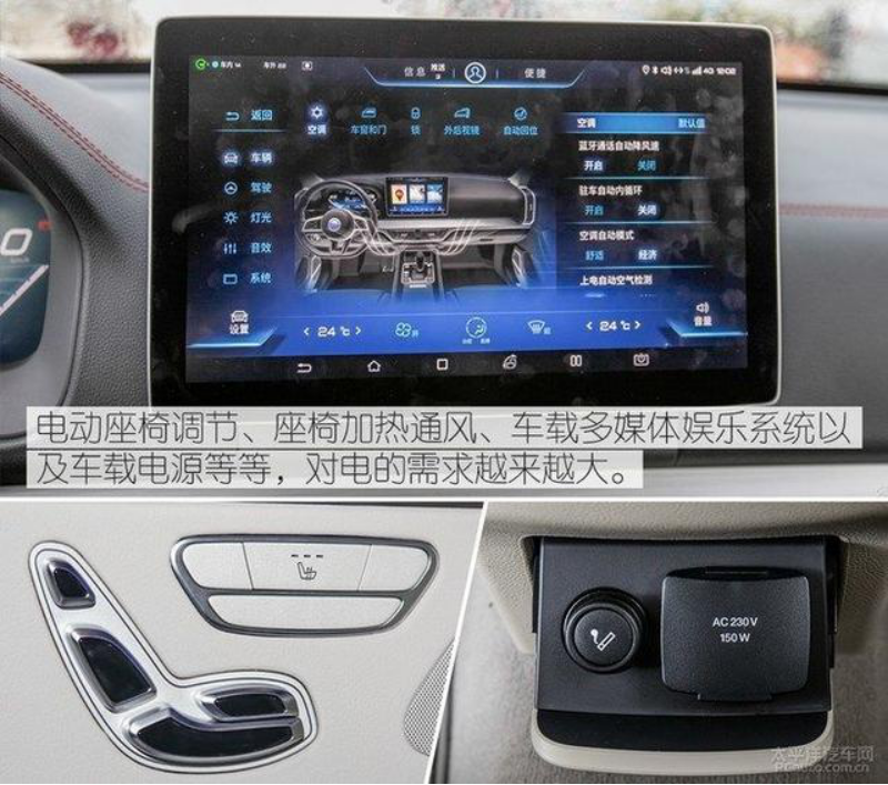 另外,像很多车载的舒适配置也是用电大户,座椅加热、座椅通风、电动座椅调节、车载多媒体娱乐系统以及车载电源等等,对电的需求都越来越大。