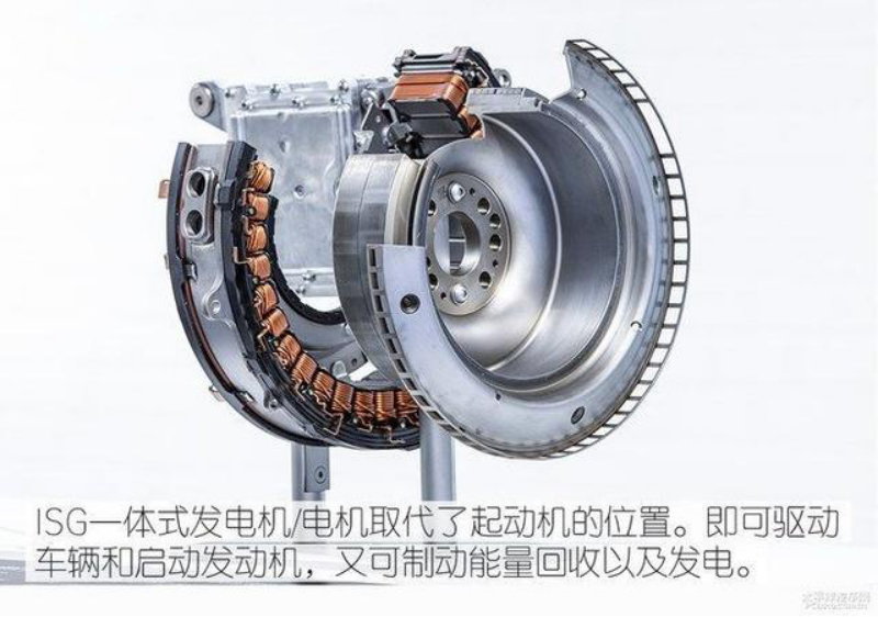而当前48V轻混系统最常见的做法就是在发动机与变速箱之间串联一个电动机,这个电动机能取代传统发动机上启动机与发电机的作用,给车发动机起步和急加速时提供一定的辅助,简单的说就是增加瞬时的马力和扭矩,使车提速轻松。同时因为电动机的加入,避开了发动机高功率输出的低效率运转区间,不像普通燃油版那么费油。