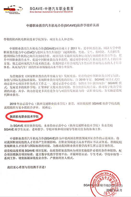 2020年6月,经过“教育部中德职业教育汽车机电合作项目(SGAVE)”中方秘书处、同济大学、中德职业教育能力中心和示范中心的推荐和评估,公司被确定为“教育部中德职业教育汽车机电合作项目(SGAVE)”伙伴公司。