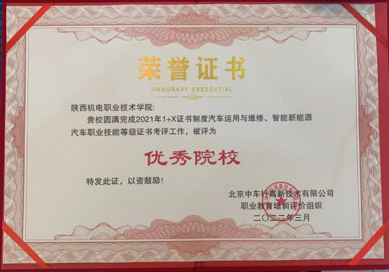 近日,公司汽车工程公司收到“1+X”汽车专业领域职业技能等级证书评价组织—北京中车行高新技术有限公司发来的荣誉证书,祝贺公司圆满完成2021年1+X证书制度汽车运用与维修、智能新能源汽车职业技能等级证书考评工作,成绩优异,被评为“优秀院校”。