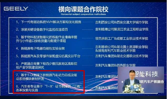 会中发布了2022年吉利汽车横向课题项目,公司2个课题成功入选,分别是“基于“1+X”制度下新能源汽车动力总成及驱动系统模块教材开发”和“汽车类专业基于“1+X”证书制度的“三教”改革探索与实践”。