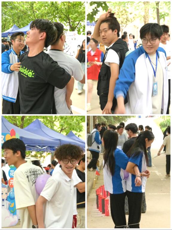 螃蟹赛跑。两人一组背夹气球横向移动了,默契小组迅速冲向终点,气球掉落的意外状况也引发阵阵欢笑。游戏让同学们在奔跑中释放压力,更深刻体会到团队合作的重要性。