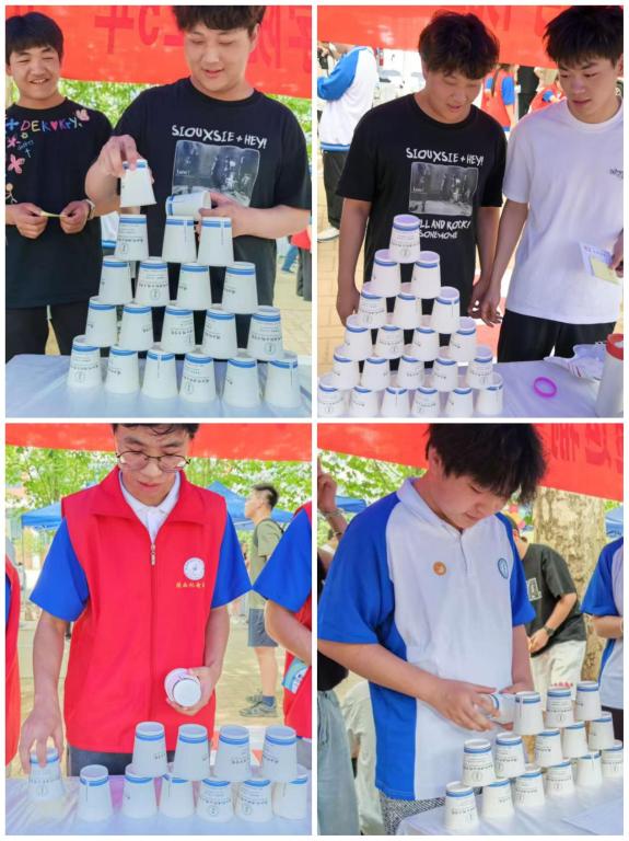 叠杯塔。杯碟碰撞声与加油声不断,同学们专注堆叠杯子,追求速度与稳固。每一次成功的堆叠,都让参与者收获满满的成就感,也在挑战中锻炼了专注力与手眼协调能力。