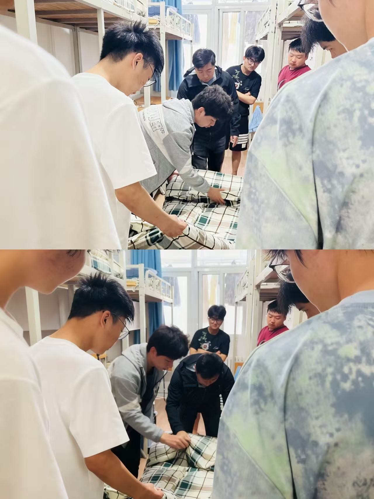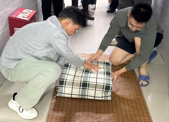 在活动现场,王书记与辅导员深入宿舍,亲自示范“豆腐块”被褥的叠法、书桌物品的收纳方式及用电规范操作,并结合实际案例,详细讲解宿舍文明建设的重要意义和具体要求。他强调,宿舍不仅是员工学习生活的重要阵地,更是展现精神风貌的重要窗口。整洁有序的环境关乎个人健康与安全,也体现着集体的文明风尚,希望同学们从点滴做起,以细节见精神,养成良好习惯,共同营造积极向上的校园氛围。