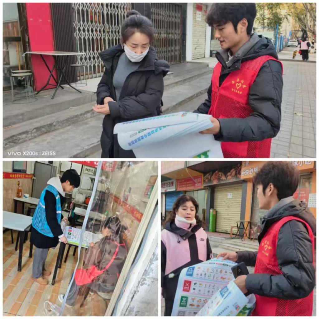在社区广场垃圾分类宣传点,团员志愿者们通过垃圾分类知识手册与趣味图解海报,通过 “实物辨认 + 案例讲解” 的方式向居民普及分类知识。“阿姨,您看这个废旧电池属于有害垃圾,要投进红色垃圾桶”“快递纸箱拆平后放入可回收物桶,能节省运输空间”,志愿者们耐心解答居民疑问,还现场演示分类投放流程。针对部分老年居民对分类标准不熟悉的问题,志愿者一对一发放 “分类指引卡”,标注常见垃圾的分类类别与投放时间,累计覆盖居民20 余人次,有效提升了社区居民的垃圾分类意识。