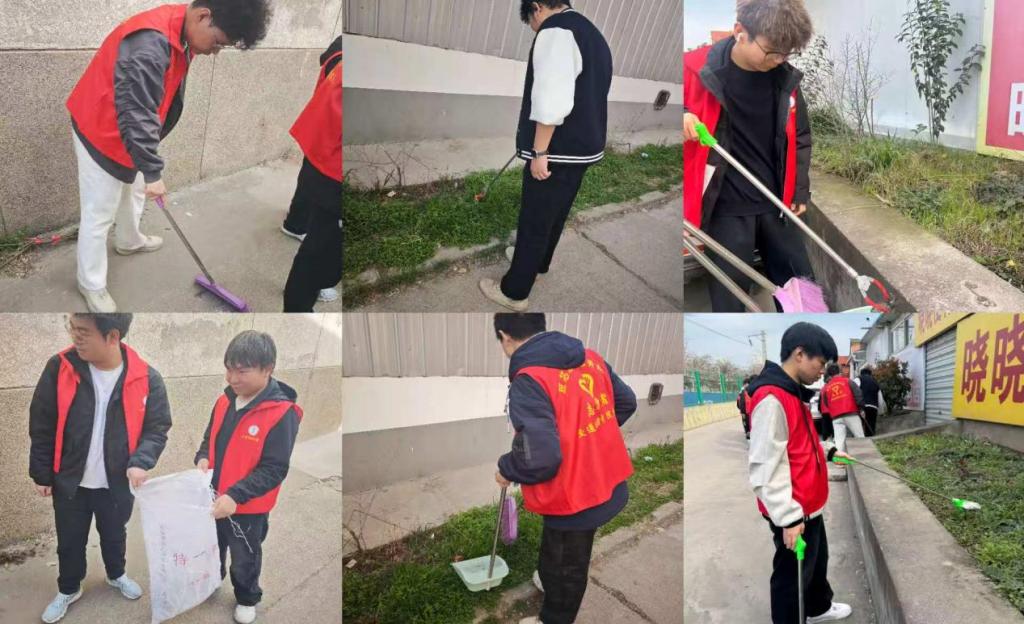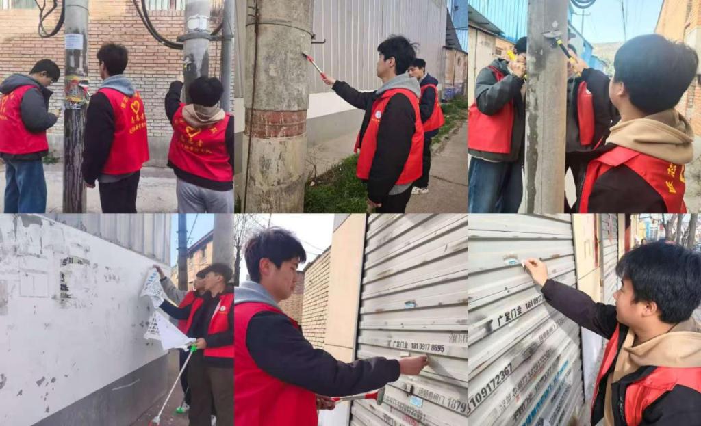 活动伊始,12名团员迅速集结、合理分工,分为两个小组同步开展工作,确保高效有序推进清洁任务。第一小组手持扫帚、垃圾夹、垃圾袋等工具,重点对社区房屋周边、道路沿线、绿化带等区域进行全面清理,认真捡拾塑料袋、纸屑、饮料瓶等生活垃圾,细致清扫堆积落叶,不放过一处卫生死角,让社区公共空间更加整洁清爽。第二小组携带铲刀、喷壶、抹布等工具,专注清理墙面、电线杆、宣传栏上的违规小广告与乱贴乱画,大家耐心铲除顽固贴纸、擦拭残留污渍,有效恢复社区公共设施整洁面貌,提升社区整体颜值。