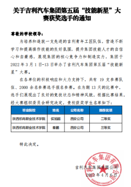 吉利汽车集团于2022年3月1日-13日举办了吉利汽车集团第五届“技能新星”大赛。 共有吉利汽车集团19支参赛队伍、2000余名参赛选手报名参赛。在为期 13 天的比赛中,公司毕业生17汽修五年1班侯旭超和16汽修五年1班秦鹏以优异的表现,分别获得二等奖和三等奖。