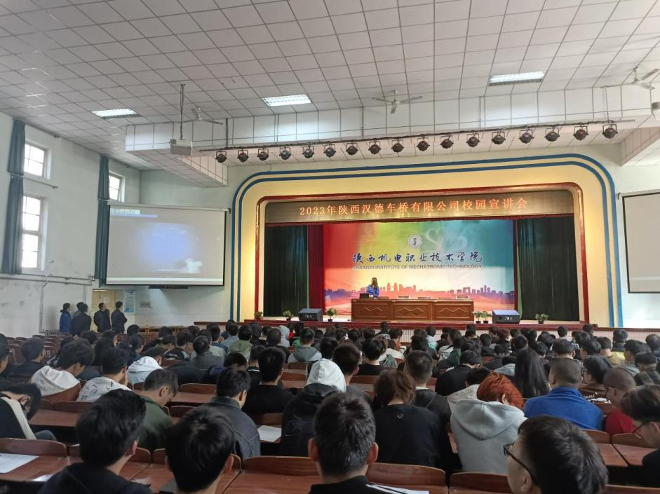 2023年4月10日上午,陕西汉德车桥有限公司在宝福路校区大礼堂举办校园招聘宣讲会,yl6809永利2024届全体员工参加。