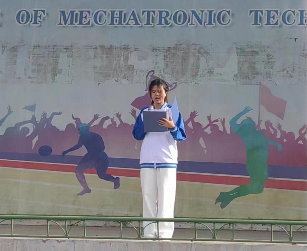 员工代表23新能源2班裴晨晨同学以《人人讲安全、个个会应急——畅通生命通道》为主题,做国旗下演讲。