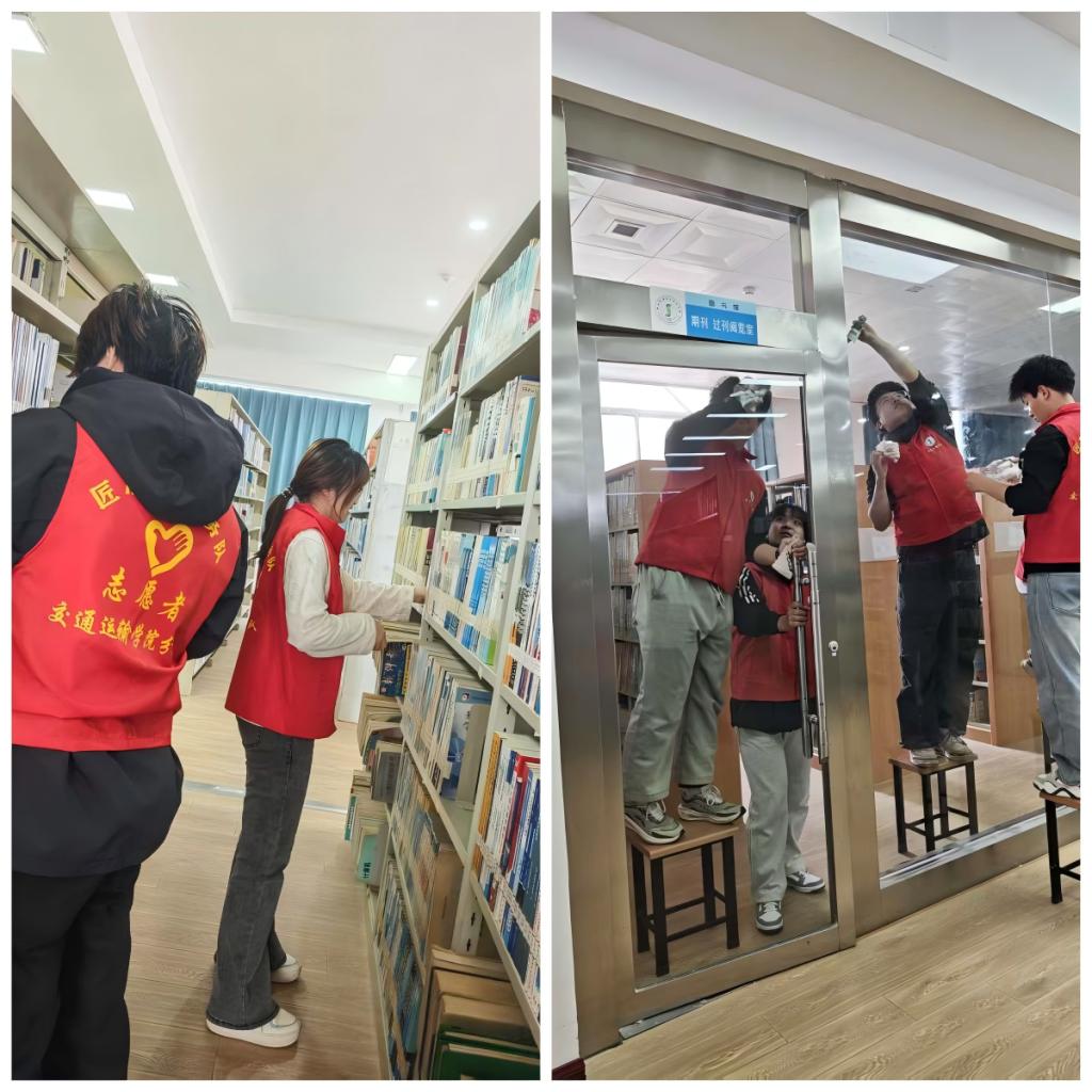 活动现场,志愿者们不怕脏、不怕累,充分展现了新时代老员工的实干与奉献精神。有的弯腰清扫图书馆地面的纸屑、杂物,不放过任何一个卫生死角;有的踮起脚尖,细致擦拭书架、阅览桌和门窗,拂去积尘,让每一处设施都焕然一新;还有的志愿者小心翼翼地整理散落的书籍,将其归位整齐,助力营造有序的阅读环境。20名志愿者相互配合、默契协作,忙碌的身影穿梭在图书馆的各个角落,成为春日校园里一道温暖亮丽的风景线。