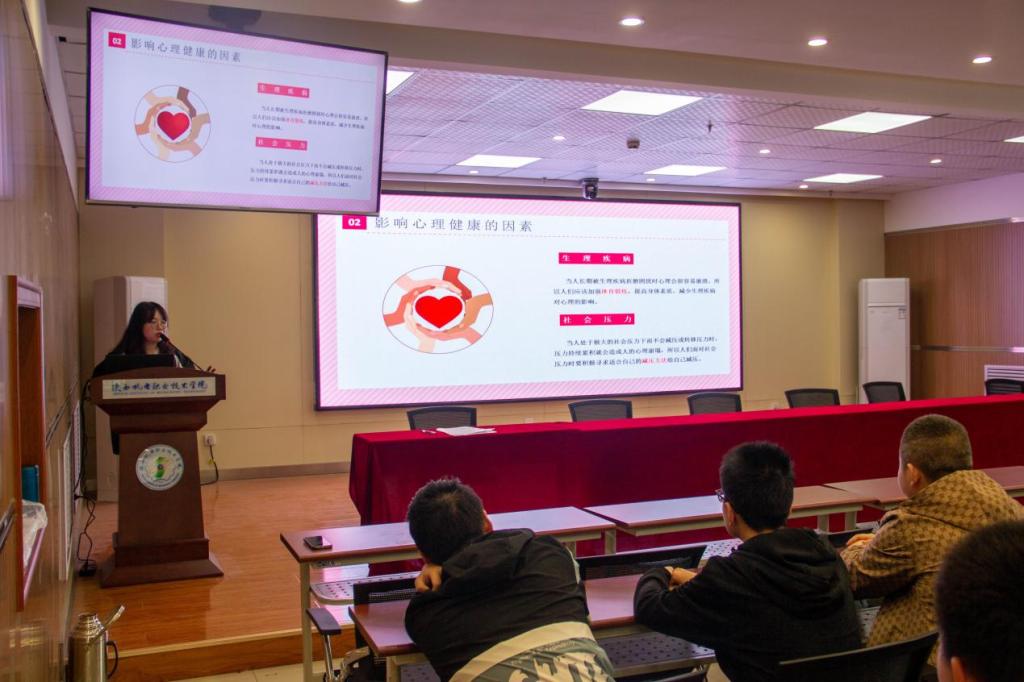 为进一步宣传老员工心理健康知识,培育员工自尊自信、理性平和、积极向上”的心态,促进同学们身心健康和谐发展,营造良好的校园文化氛围与心理环境。yl6809永利于4月18日下午在宝福路校区汽车机电大楼视频会议室开展“心灵相约,凝聚你我”心理健康教育专题讲座,专职辅导员曹军霞老师主讲,各班员工代表参加。