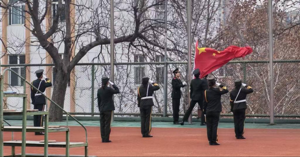 国旗护卫队队员身着挺拔礼装,迈着铿锵有力的正步护送五星红旗入场。晨光熹微里,鲜红的国旗迎风舒展,雄壮的国歌响彻运动场,庄重的仪式感扑面而来,雷锋精神的温度与职业素养的力量也在师生心中悄然升腾。