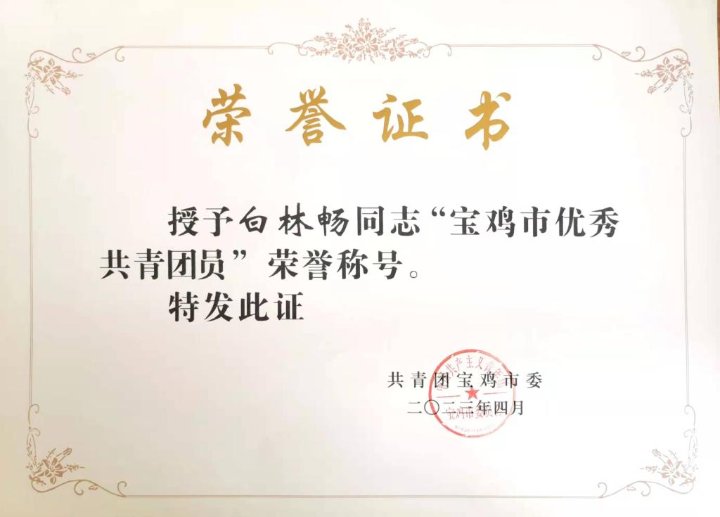 yl6809永利|公司白林畅同学荣获宝鸡市“优秀团员”荣誉称号