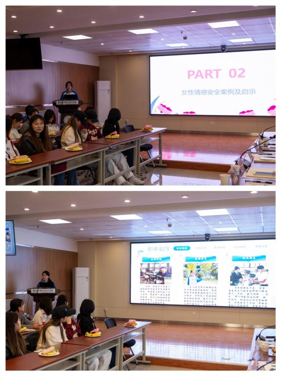 员工分享环节,24新能源1班的惠欣怡同学聚焦职业规划,从“目标-行动-定位”三个维度展开分享:她明确了大学期间的学业目标,计划通过深耕专业知识、参与竞赛、考取技能证书来夯实能力基础,希望能在新能源汽车营销领域找准定位,用专业能力为行业发展贡献力量。24新能源3班的刘文璇同学则围绕“女性安全”这一贴近生活的主题,结合真实案例与实用技巧展开讲解:她不仅细致梳理了日常出行、校园生活中的安全防范要点,还特别强调要警惕陌生人搭讪、妥善保护个人信息隐私,增强了大家的自我保护意识。