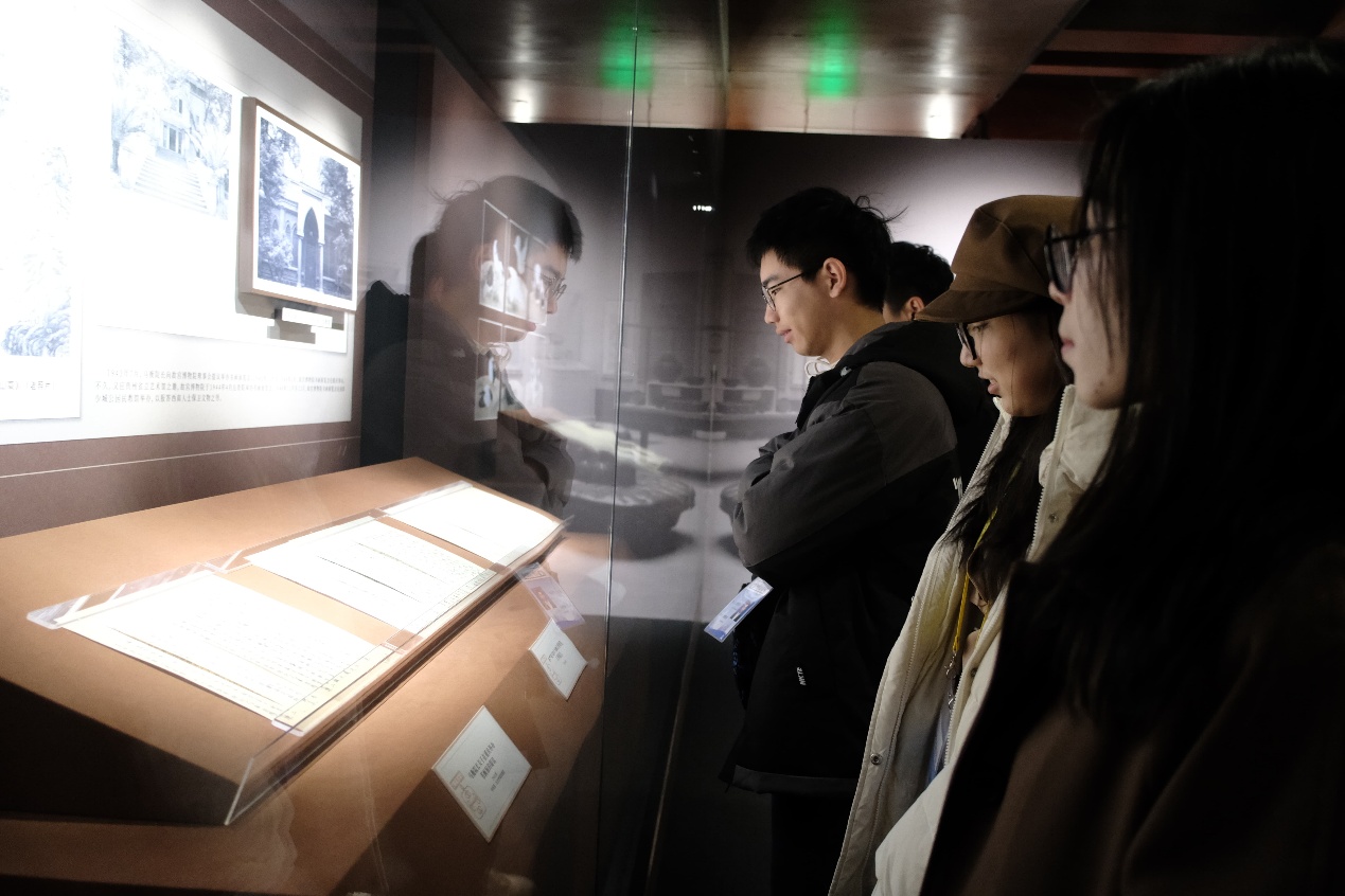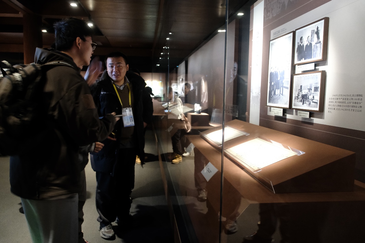 在展厅内,同学们随典籍文物重温这场意义非凡的国宝征途,见证了它们所折射的波澜壮阔、跌宕起伏的历史记忆。大家在“南迁北归 国宝永存”展区为文物波折多舛的命运而揪心,在“古物重光 文脉赓续”展区纷纷感叹于北归后故宫文物再现荣光、走向世界的辉煌,又在“薪火相传 生生不息”展区为当时社会各界人士守护中华文化根脉的事迹深深感动。参观之余,同学们还结合所学知识,以客观理性态度分析了文物转移的背景、缘由与过程,深感国家文化安全的重要意义。这也为同学们日后在学习和研究中赓续文化传统、坚定文化自信奠定了基石。