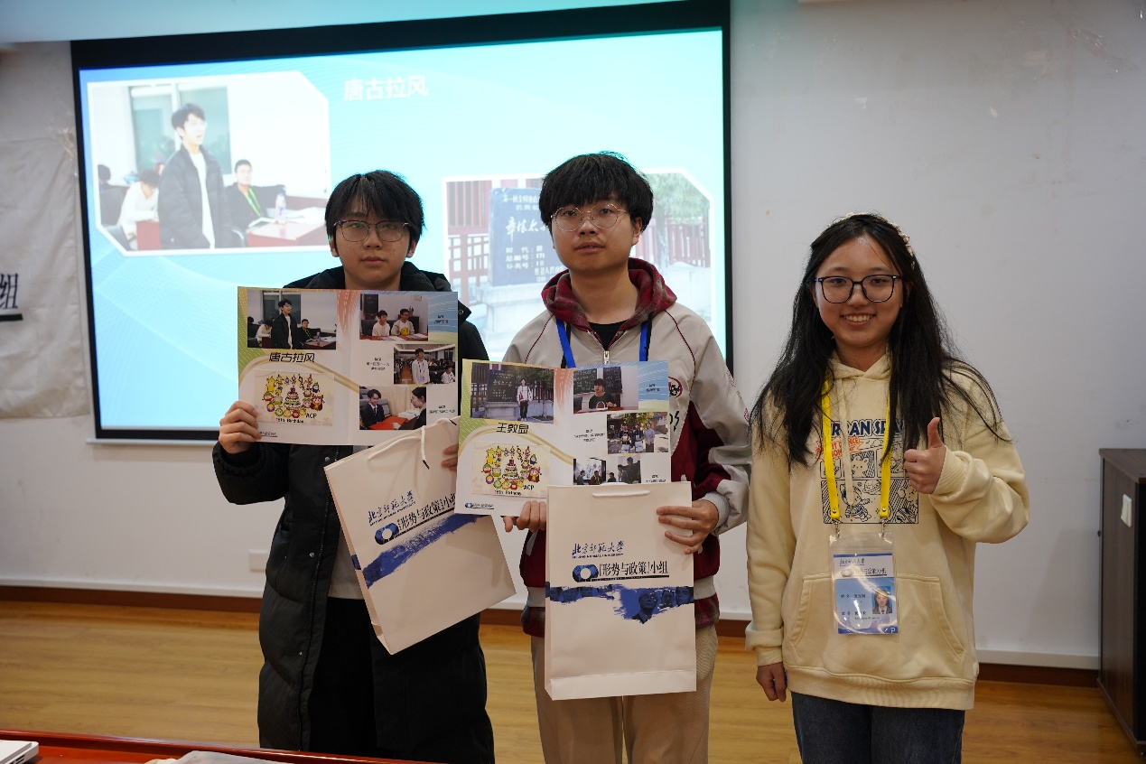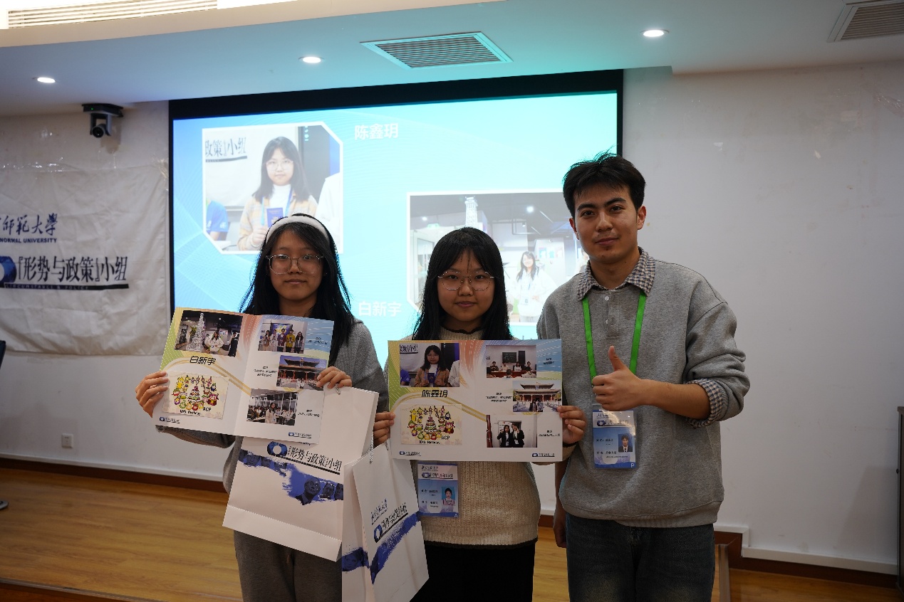 在2025年12月27日举行的“News Today”环球论坛第二十场上,小组2025级新成员自由组队、通力合作,精准剖析时事前沿热点,汇报展示获得了公司、公司领导嘉宾和专家学者的一致好评。小组宣传顾问丁旭辉向各队代表罗子键、刘采欣和张志航同学颁发纪念光盘,勉励他们继续为小组的建设和发展贡献力量。